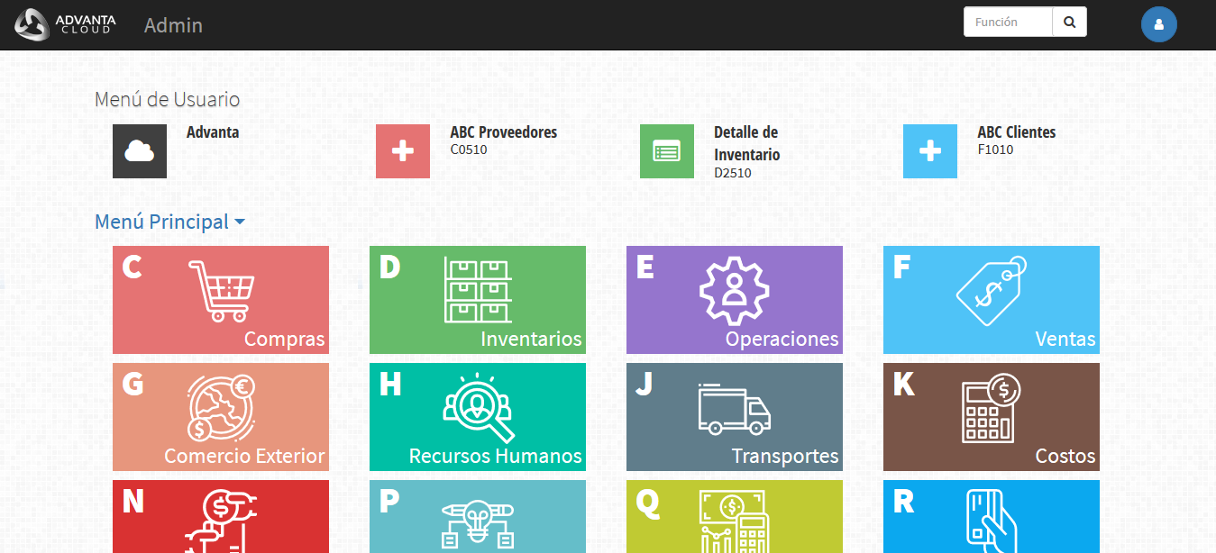 Dentro de Advanta Cloud es posible personalizar la pantalla principal para agregar opciones de menú personalizadas para cada uno de los usuarios. Esto con el objetivo de permitir un acceso rápido a las opciones que más utilizan los usuarios.