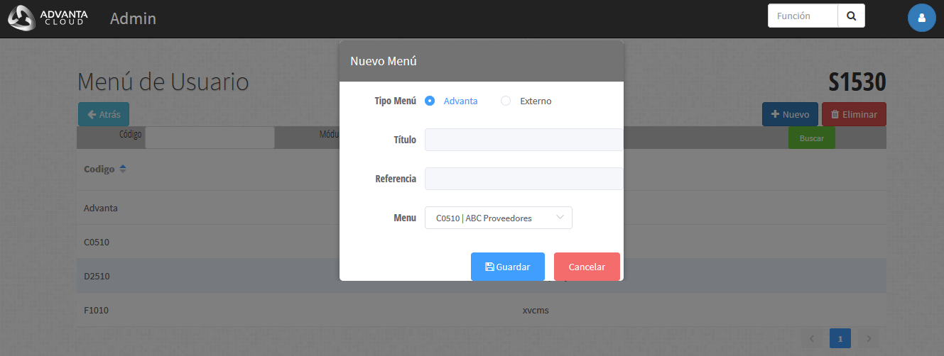 En la función S1530 se pueden dar de alta los menús ya sean funciones de Advanta o Links Externos.